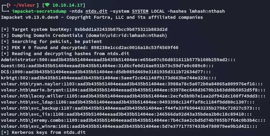 impacket-secretsdump -ntds ntds.dit -system SYSTEM LOCAL -hashes lmhash:nthash