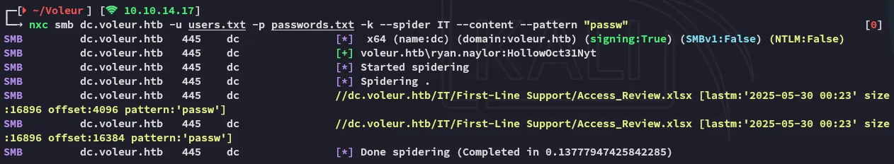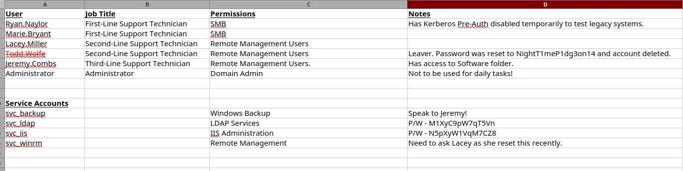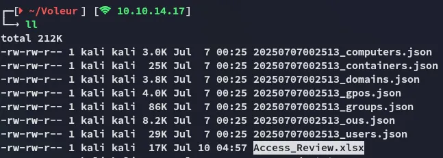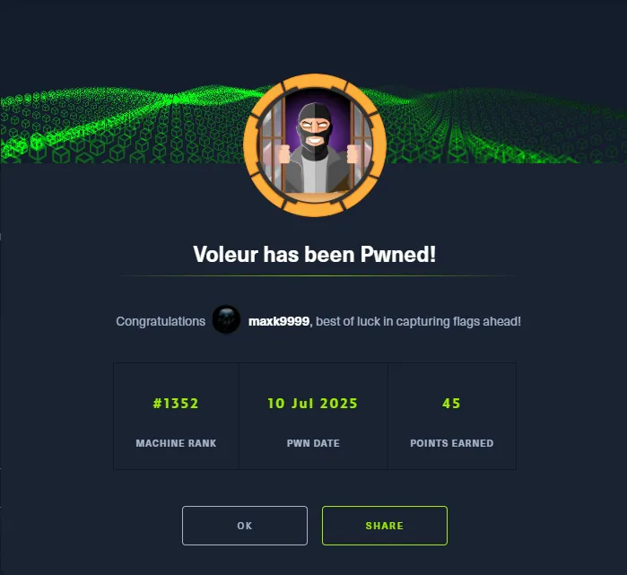 PORT STATE SERVICE REASON VERSION53/tcp open domain syn-ack Simple DNS Plus88/tcp open kerberos-sec syn-ack Microsoft Windows Kerberos (server time: 2025-07-06 22:15:11Z)135/tcp open msrpc syn-ack Microsoft Windows RPC139/tcp open netbios-ssn syn-ack Microsoft Windows netbios-ssn389/tcp open ldap syn-ack Microsoft Windows Active Directory LDAP (Domain: voleur.htb0., Site: Default-First-Site-Name)445/tcp open microsoft-ds? syn-ack464/tcp open kpasswd5? syn-ack593/tcp open ncacn_http syn-ack Microsoft Windows RPC over HTTP 1.0636/tcp open tcpwrapped syn-ack2222/tcp open ssh syn-ack OpenSSH 8.2p1 Ubuntu 4ubuntu0.11 (Ubuntu Linux; protocol 2.0)3268/tcp open ldap syn-ack Microsoft Windows Active Directory LDAP (Domain: voleur.htb0., Site: Default-First-Site-Name)3269/tcp open tcpwrapped syn-ack5985/tcp open http syn-ack Microsoft HTTPAPI httpd 2.0 (SSDP/UPnP)|_http-server-header: Microsoft-HTTPAPI/2.0|_http-title: Not Found9389/tcp open mc-nmf syn-ack .NET Message Framing49664/tcp open msrpc syn-ack Microsoft Windows RPC49668/tcp open msrpc syn-ack Microsoft Windows RPC51685/tcp open ncacn_http syn-ack Microsoft Windows RPC over HTTP 1.051686/tcp open msrpc syn-ack Microsoft Windows RPC51688/tcp open msrpc syn-ack Microsoft Windows RPC51716/tcp open msrpc syn-ack Microsoft Windows RPC62733/tcp open msrpc syn-ack Microsoft Windows RPCService Info: Host: DC; OSs: Windows, Linux; CPE: cpe:/o:microsoft:windows, cpe:/o:linux:linux_kernel