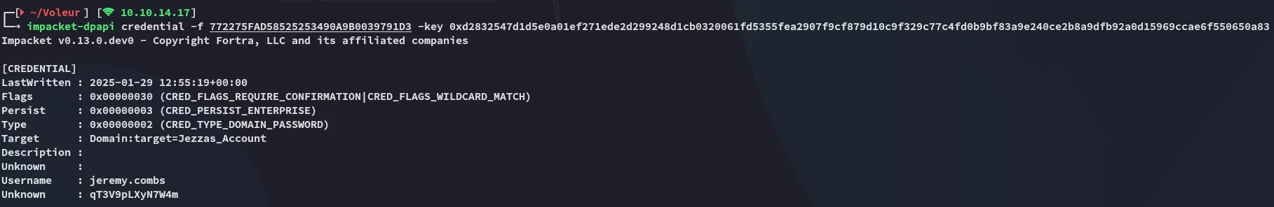 impacket-dpapi credential -f 772275FAD58525253490A9B0039791D3 -key 0xd2832547d1d5e0a01ef271ede2d299248d1cb0320061fd5355fea2907f9cf879d10c9f329c77c4fd0b9bf83a9e240ce2b8a9dfb92a0d15969ccae6f550650a83