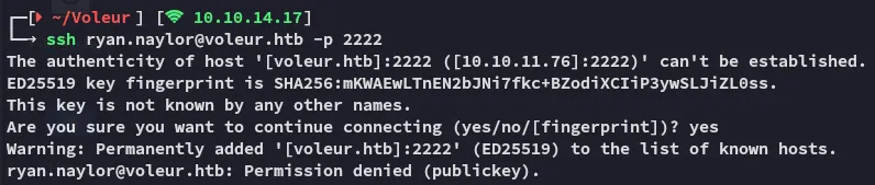 Host script results:| p2p-conficker:| Checking for Conficker.C or higher...| Check 1 (port 48495/tcp): CLEAN (Timeout)| Check 2 (port 28661/tcp): CLEAN (Timeout)| Check 3 (port 60782/udp): CLEAN (Timeout)| Check 4 (port 35476/udp): CLEAN (Timeout)|_ 0/4 checks are positive: Host is CLEAN or ports are blocked| smb2-security-mode:| 3:1:1:|_ Message signing enabled and required|_clock-skew: 7h59m57s| smb2-time:| date: 2025-07-06T22:16:03|_ start_date: N/AI tried logging into ssh 2222 but got denied: