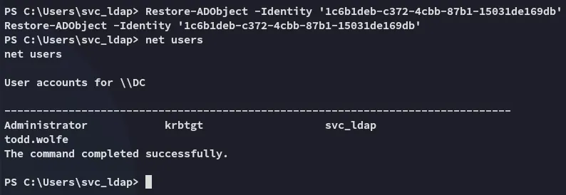 Restore-ADObject -Identity '1c6b1deb-c372-4cbb-87b1-15031de169db'