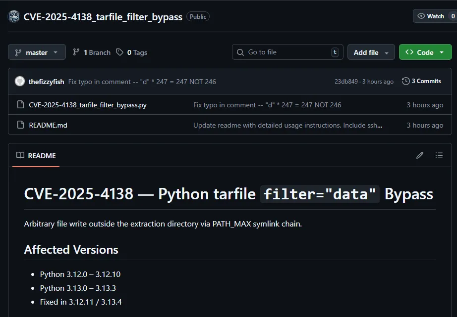 https://github.com//thefizzyfish//CVE-2025-4138_tarfile_filter_bypass